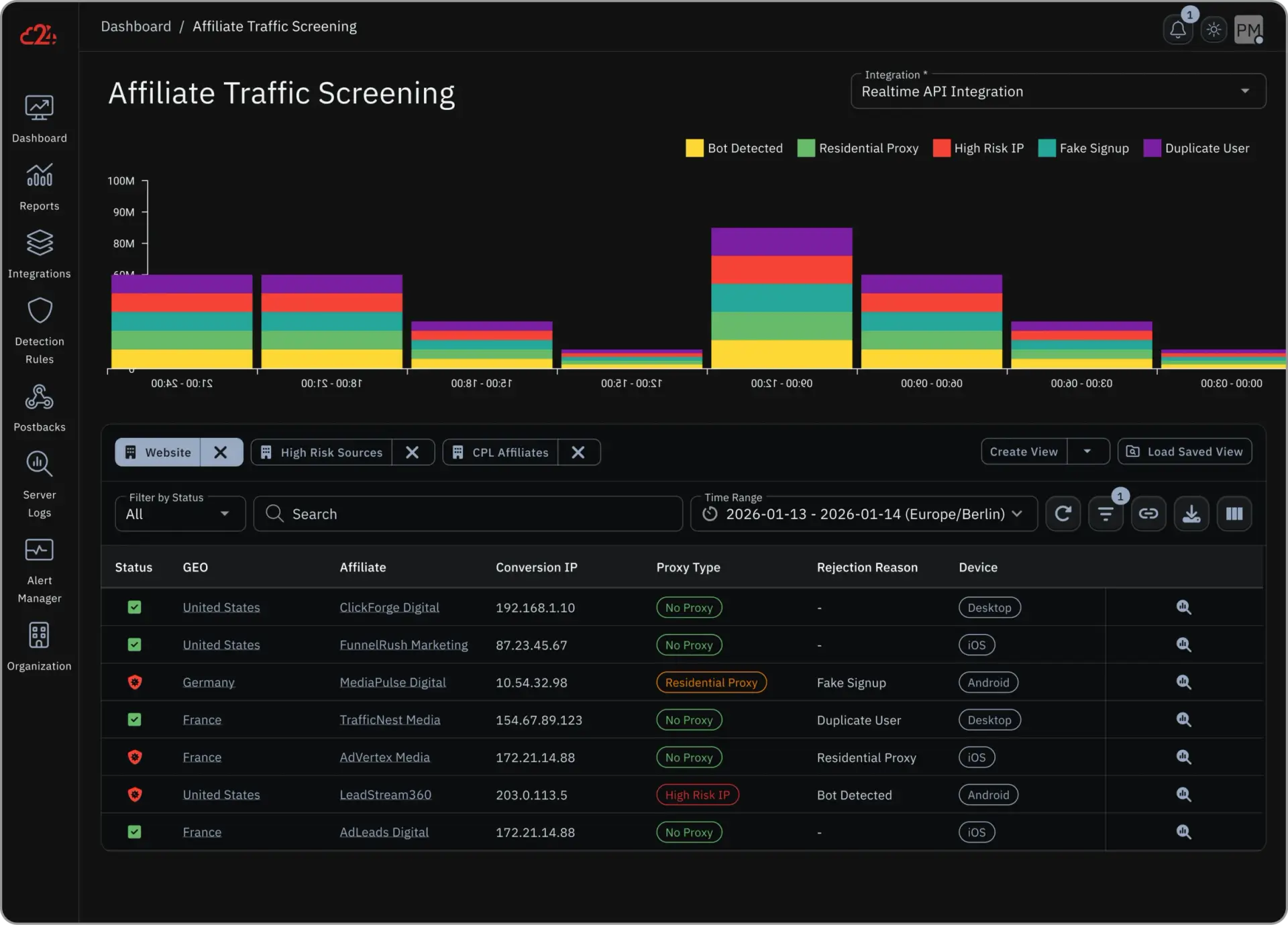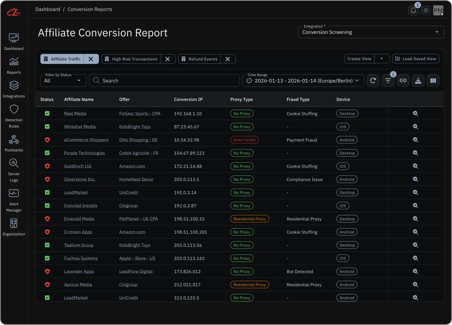 Our Reports are detailed and show exactly where the Fraud came from and what the reason was (e.g. Fake Signup, Residential Proxy, Cookie Stuffing etc.)