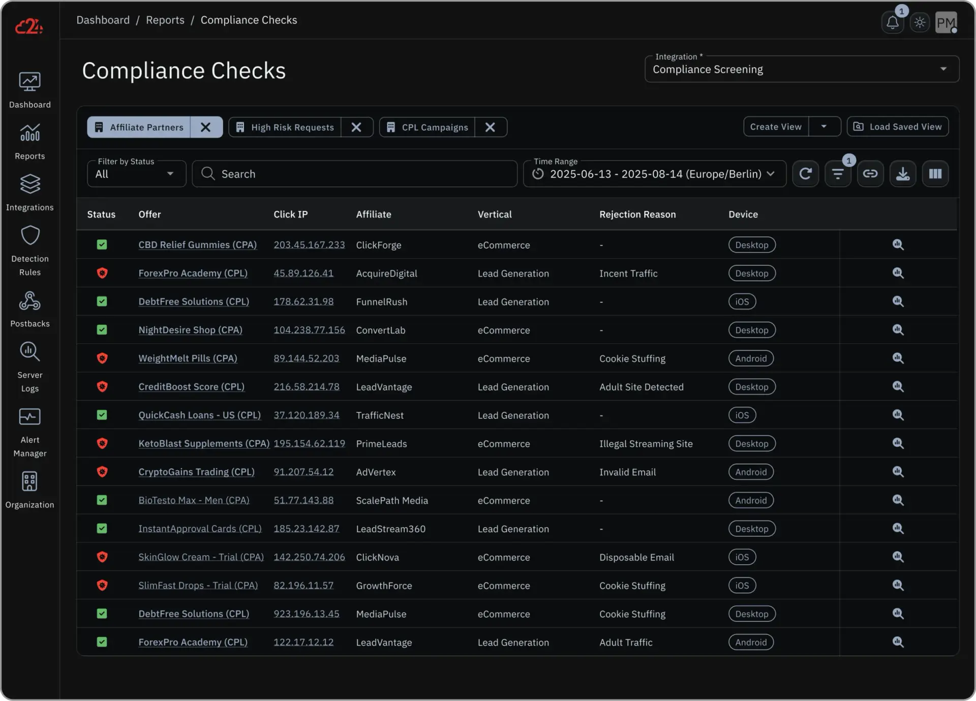 Our cookie stuffing detection identifies these fraudulent attribution attempts in real time, analyzing click patterns and timing anomalies that indicate click spam activity. When fraud is detected, we automatically block the postback to your tracking platform, ensuring payouts only go to affiliates who legitimately drove the sale. Read our article about Cookie Stuffing Fraud.