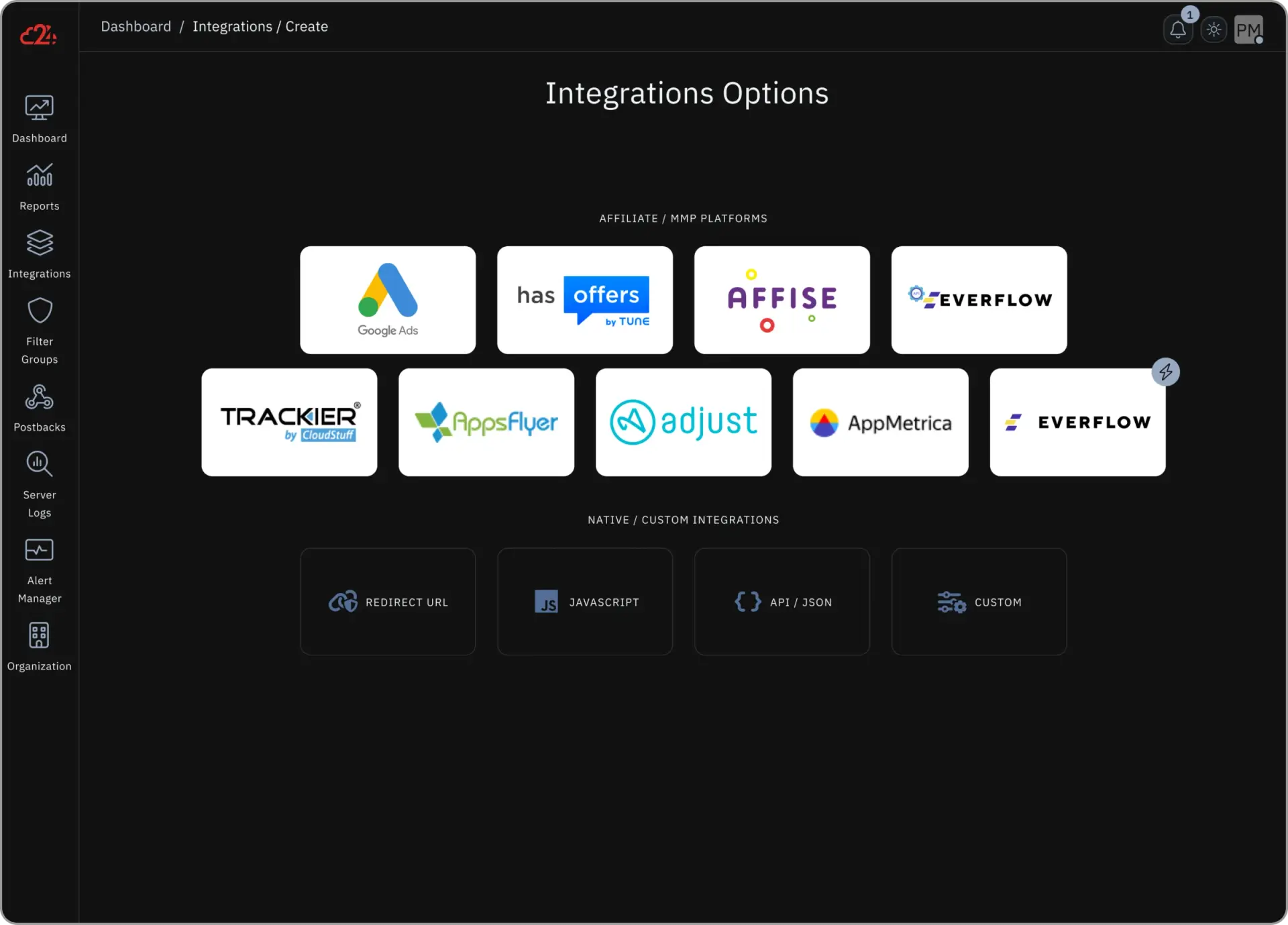 Connect seamlessly with existing Affiliate Platforms (e.g. Everflow, Affise, Tune) / MMPs (e.g. Appsflyer, Adjust) or connect via API or JavaScript Tags.