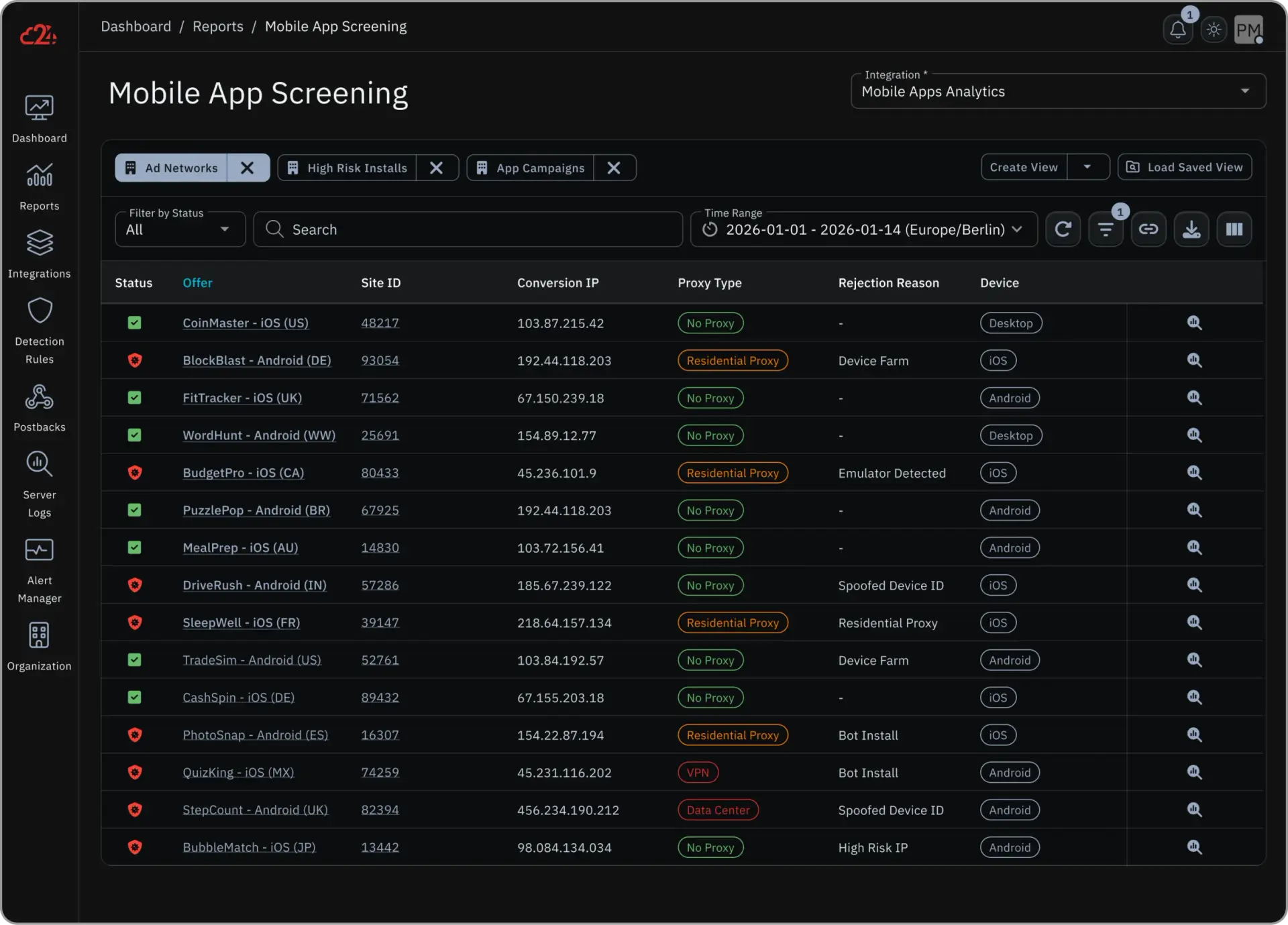 Our device fingerprinting technology identifies duplicate users across accounts, even when they switch IPs or clear cookies. We detect VPN and proxy traffic in real time, blocking repeat abusers before they complete another offer and protecting your incentivized traffic from fraud. Read more about stopping Fraud on Offer Walls.