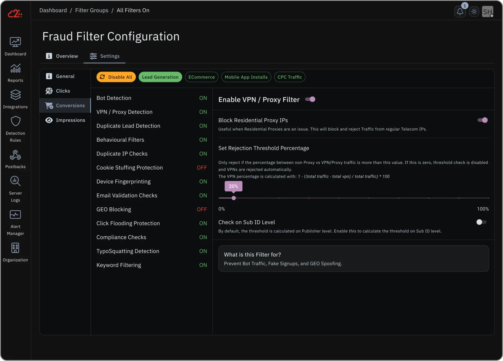 Yes. Our filters are fully adjustable per traffic source. You can set strictness levels from tolerant to strict, giving you full control over how aggressively fraud is blocked for each partner.